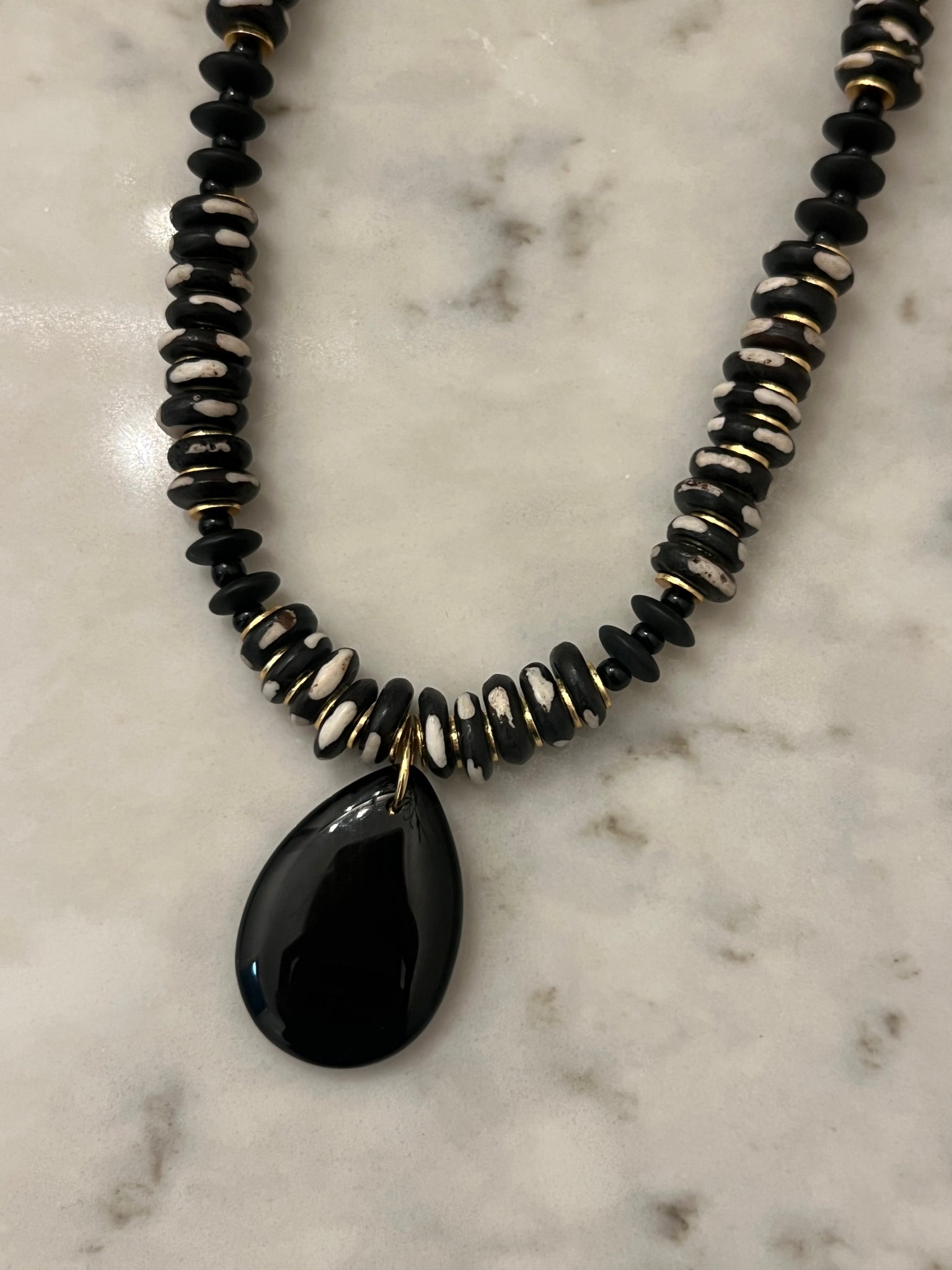 This handmade necklace is made with bone and wooden beads and adorned with a black onyx pendant.